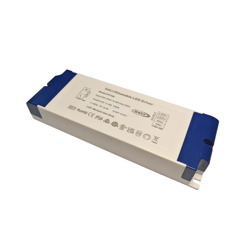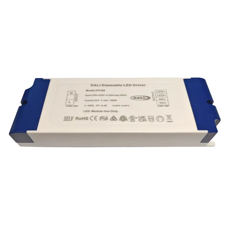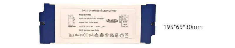 Som en profesjonell produsent av konstantspennings DALI-drivere i Kina, kan Starwell gi deg en høykvalitets 100W konstantspennings-DALI-driver for 24V dimbare applikasjoner, som tilbyr en stabil 24V/4.16A DC-utgang med en effektivitet på opptil 90 %. Den støtter jevn, flimmerfri dimming fra 100 % til 0,1 % og har omfattende beskyttelsesfunksjoner for kortslutning, overspenning, overbelastning og overtemperatur.
