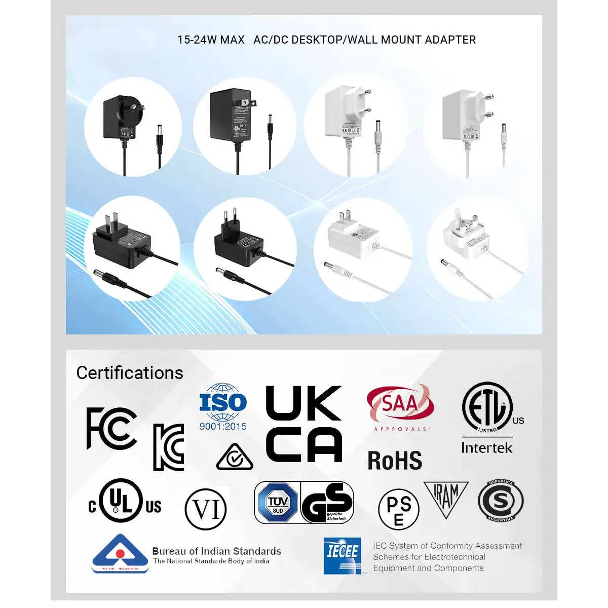 24W strømadapter-serien oppfyller strenge internasjonale standarder og kan skryte av globale sertifiseringer, inkludert CE/FCC/UL/RCM/SAA/UKCE/KC/BIS/PSE-sertifikat, som sikrer sikkerhet og miljøsamsvar. Dens europeiske pluggdesign muliggjør sikre tilkoblinger, noe som gjør den enkel å bruke i ulike innstillinger.