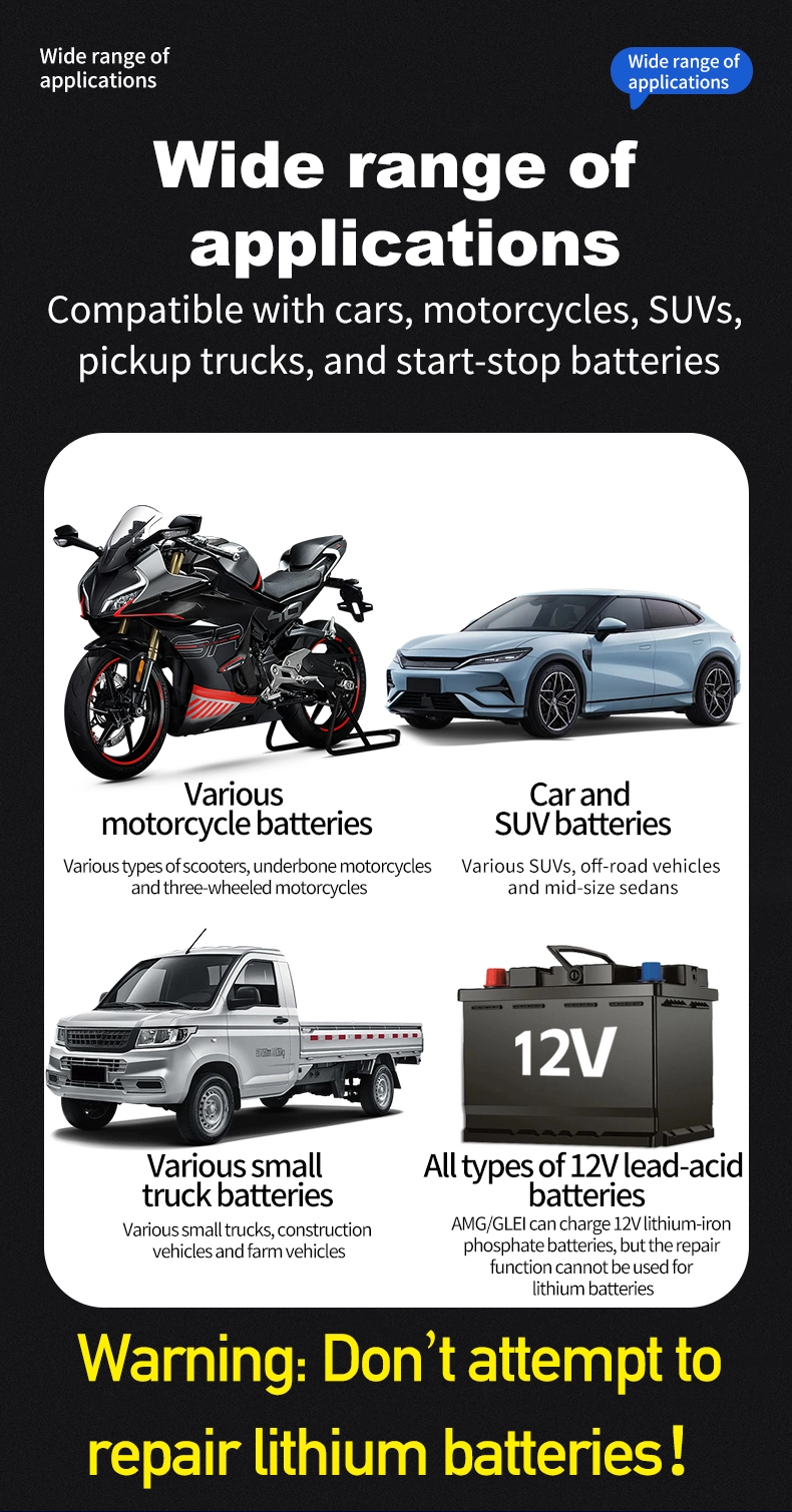 1. Universell kompatibilitet og støtte for flere batterier: Den fungerer sømløst med alle 12V batterityper, inkludert blysyre, AGM, Gel og LiFePO4, og dekker batterikapasiteter fra 6Ah til 180Ah. Det brede inngangsområdet på 110~230V eliminerer regionale begrensninger, noe som gjør det brukbart i over 100 land og regioner rundt om i verden.
