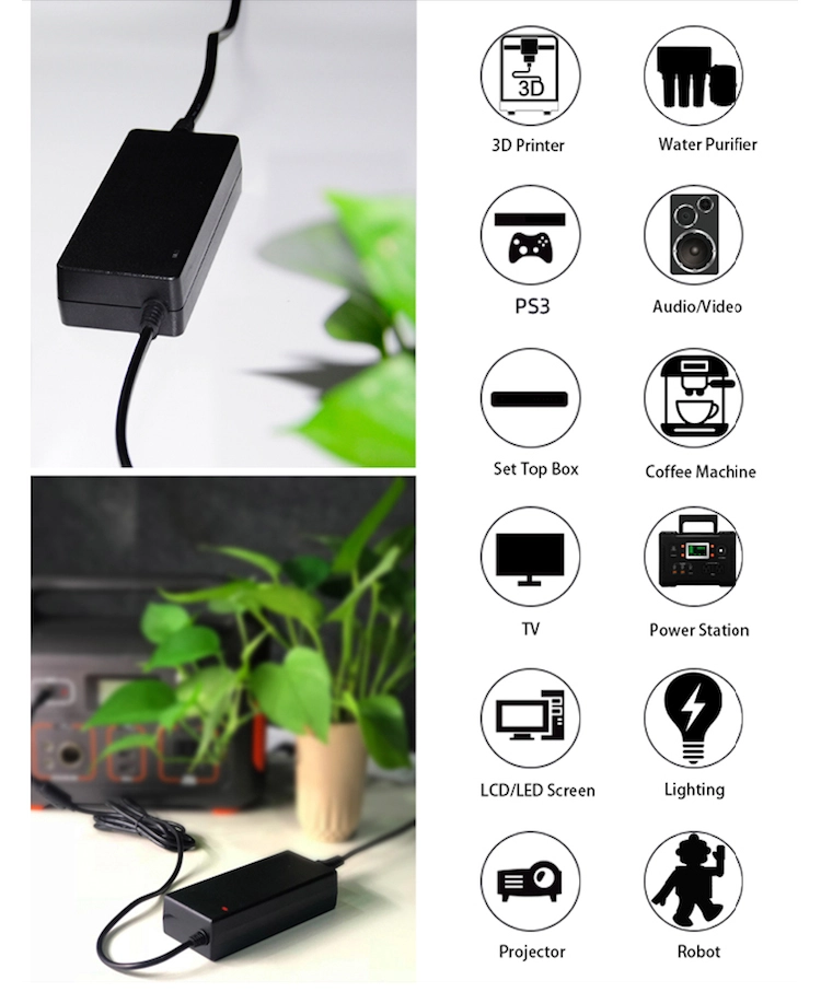 * Flere enheter for 120W-serien: 12V/15V/20V/24V/36V/48V tilgjengelig * Sikkerhet: OCP/OVP/OTP, SCP, automatisk overbelastningsavskjæring, overspenningsbryting, automatisk termisk stans. * Bred kompatibilitet: LED Strip-lys, 3D-skriver, radiosender/mottaker, CCTV-kameraer, subwoofer-forsterker for bil, lydforsterker, trådløs ruter, ADSL Cats, luftfukter, HUB, tastatur, BT-høyttaler, skjerm, webkamera, DVR, NVR, lyd-/videostrømforsyning