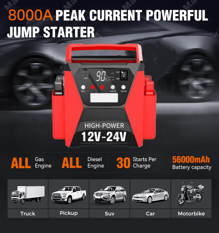 STARWELL introduserer sin høyytelses 12V/24V Car Jump Starter Intelligent Battery Charger, en spillveksler for kjøretøyeiere som søker pålitelighet og intelligens i batterivedlikehold og nødstart. Utstyrt med en 8000A toppstrøm og 4000A startstrøm, kombinerer denne tospennings intelligente batteriladeren robust kraft med smart teknologi, noe som gjør den egnet for alle gassmotorer og dieselmotorer opp til 15L, og dekker biler, lastebiler, bobiler, motorsykler, båter og til og med tunge nyttekjøretøyer.