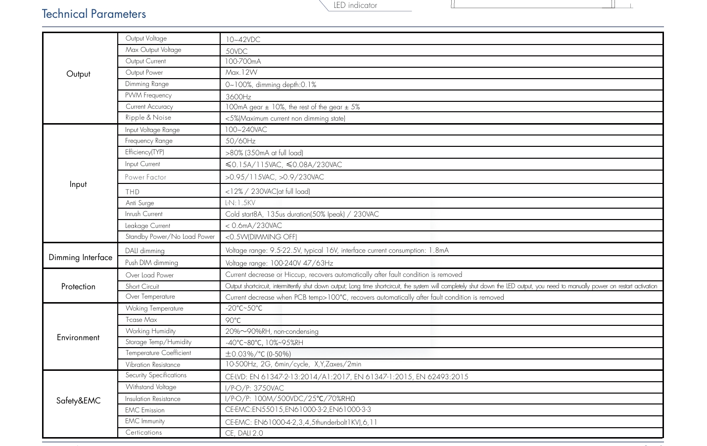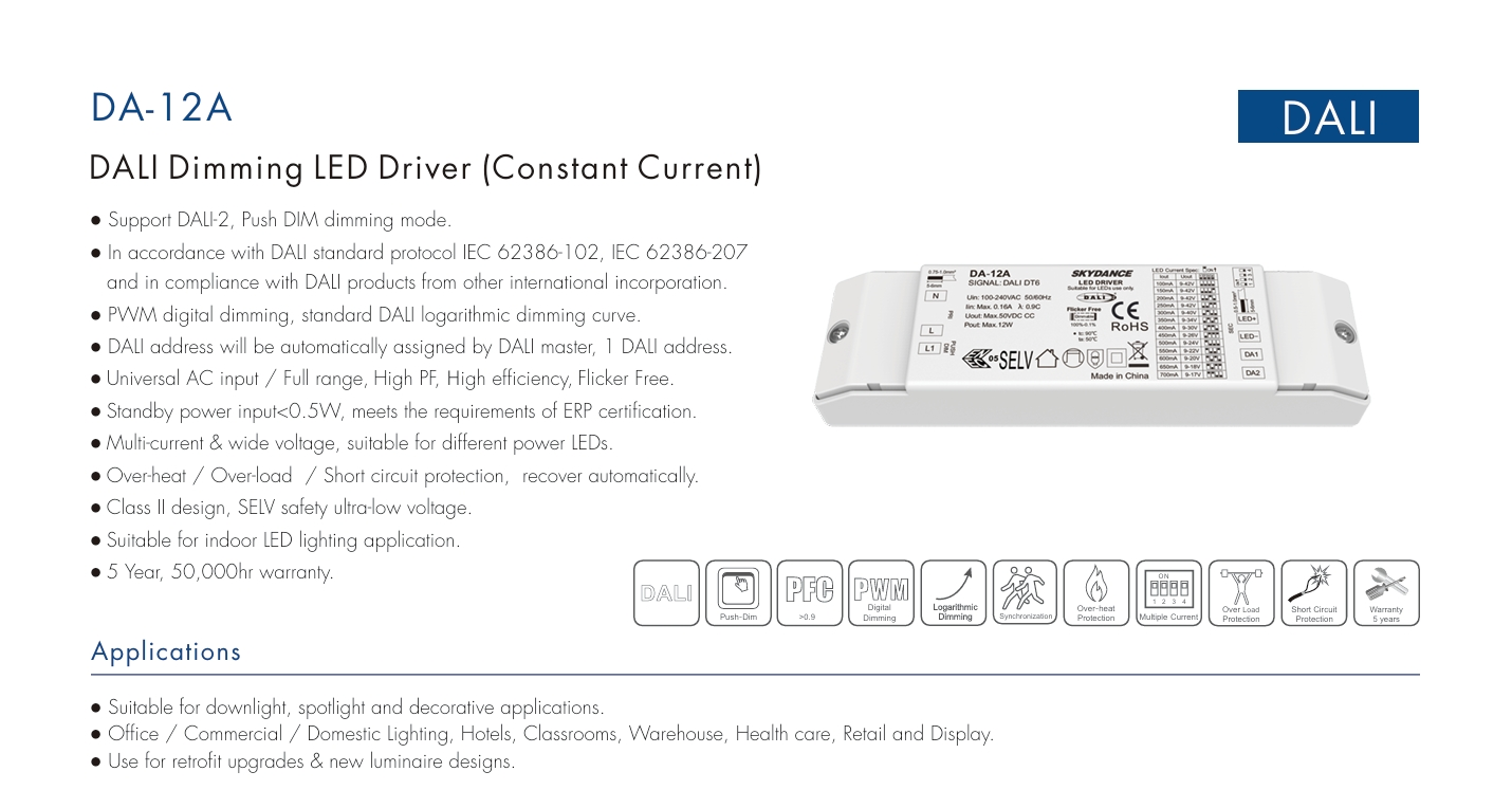 STARWELL-fabrikkens høykvalitets 12W konstantstrøm DALI-dimbar LED-driver er en kjerne med høy ytelse for intelligente lyssystemer, kompatibel med globale DALI-protokoller og 100-240V AC bred inngang. DALI dimbar LED-driver leverer stabil konstant strømutgang (100-900mA justerbar) med ±5 % nøyaktighet, og sikrer konsistent lysstyrke på tvers av armaturer. Med T-PWM dimmingsteknologi oppnår den 0,0001 % -100 % ultra-dyp dimming uten flimmer, og oppfyller IEEE 1789-standardene for øyekomfort. Med PF>0,95 og opptil 87 % effektivitet reduserer den energisvinn, mens IP20-beskyttelse og -20~50 ℃ driftstemperaturområde passer til bolig-, kommersielle og industrielle scenarier.