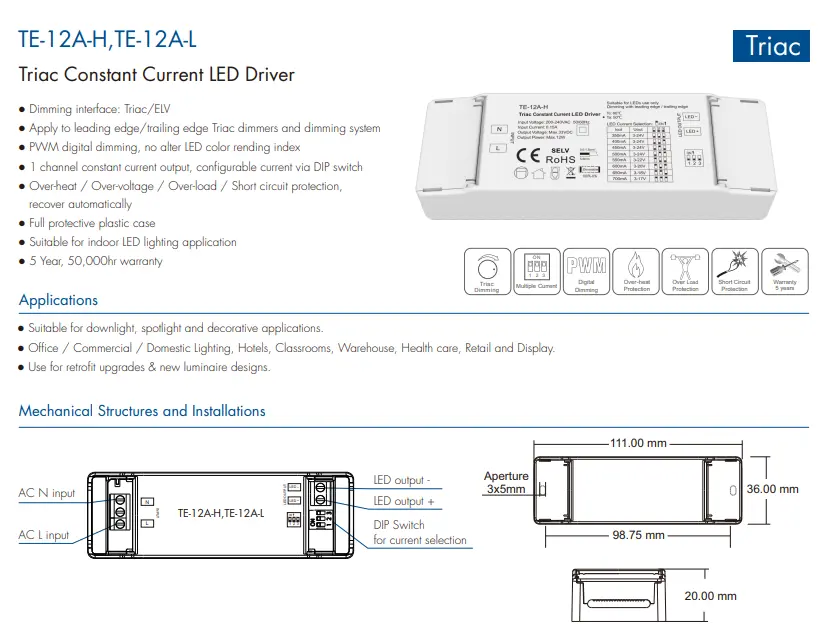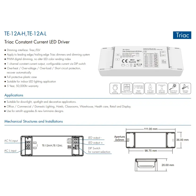 Starwell høykvalitets 12W konstantstrøm triac dimming LED-driver integrerer overspennings-, overstrøm- og kortslutningsbeskyttelsesfunksjoner, og har høy effektfaktor og lav harmonisk forvrengning, og oppfyller flere internasjonale energieffektivitets- og sikkerhetsstandarder. Den kompakte designen gjør den enkel å installere og egnet for ulike innendørs lysscenarier som downlights, spotlights og dekorative lys, noe som gjør den til en ideell driverløsning for energisparende renoveringer og smarte belysningsapplikasjoner. ProduktFunksjoner: