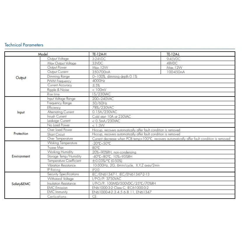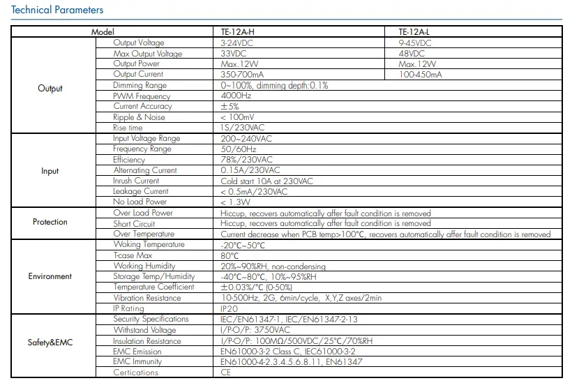 Inngangsspenning: 200–240VAC 50–60Hz Inngangsstrøm: 0,15A Utgangseffekt: 12 watt maks Utgangsspenning: 9~42V Garanti: 2 år Sertifikat: CE/Rohs