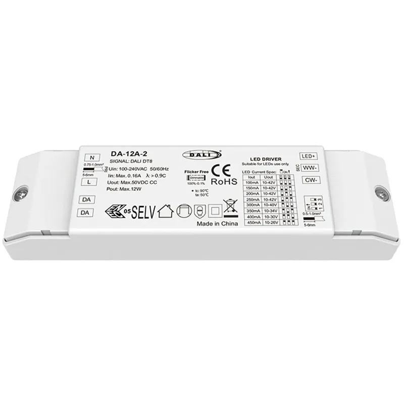 STARWELL-fabrikkens høykvalitets 12W DALI CW WW CCT dimbare LED-driver er konstruert for førsteklasses, justerbar hvit belysningsapplikasjoner som krever presis kontroll og pålitelig ytelse. Denne kompakte, høyeffektive driveren leverer en stabil 12W (12V, 1000mA) konstant strømutgang, og sikrer optimal ytelse og lang levetid for tilkoblede LED-moduler. Vår høykvalitets 12W DALI CW WW CCT dimbare LED-driver har et sofistikert Dual DALI-grensesnitt, som støtter både DALI-2 dimming (DT8) for sømløs 10%-100% jevn dimming og uavhengig CCT (Correlated Color Temperature)-innstilling fra 2700K varmhvitt til 6500K kjølig dagslys. Med en imponerende typisk effektivitet på >90 % og en høy effektfaktor (PF>0,9), minimerer den energisvinn og nettbelastning. Den er plassert i en kompakt IP20-klassifisert koffert, og tilbyr full-lastdrift innenfor et bredt temperaturområde på -20°C til +50°C, noe som gjør den til en allsidig og intelligent strømløsning for arkitektonisk, kommersiell og avansert boligbelysning.