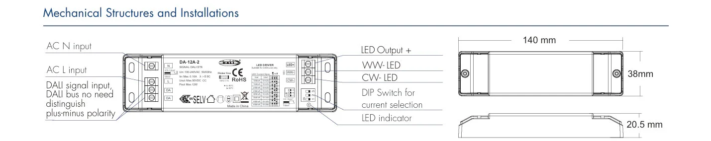 Denne dimbare LED-driveren er plassert i en kompakt IP20-kasse, og forenkler installasjonen selv i trange rom som LED-profiler eller armaturhus. Ved å kombinere konstant strømutgang, bred CCT-innstilling og industristandard DALI-2-kompatibilitet, fungerer den som en ideell og fremtidssikker driver for justerbare hvite downlights, lineære armaturer og arkitektonisk belysning – sømløst integrert i moderne smarte lysøkosystemer som en allsidig CCT-dimstrøm DALI Drive.