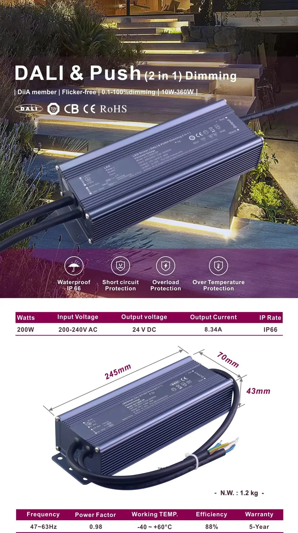 STARWELL høykvalitets 12V/24V LED-driver med konstant spenning integrerer avansert DALI-2-protokoll og brukervennlig Push Dim-funksjonalitet i en enkelt fremtidsklar enhet. Konstruert for arkitekter, lysdesignere og installatører som krever både teknisk dyktighet og praktisk fleksibilitet, forenkler denne driveren komplekse prosjekter samtidig som den leverer eksepsjonell ytelse.