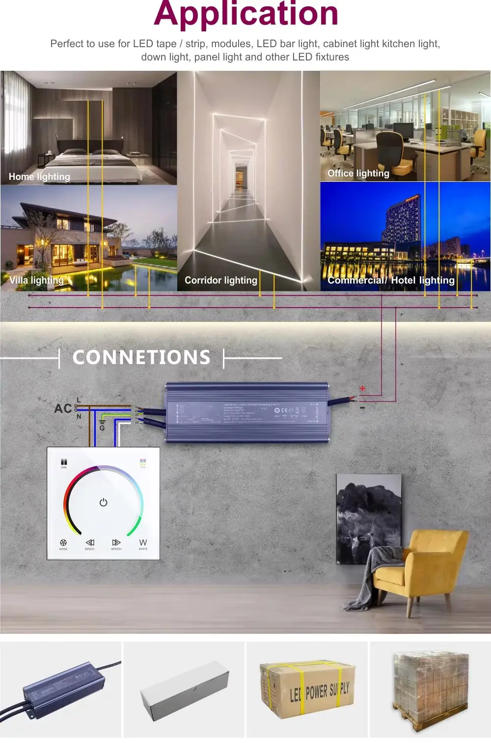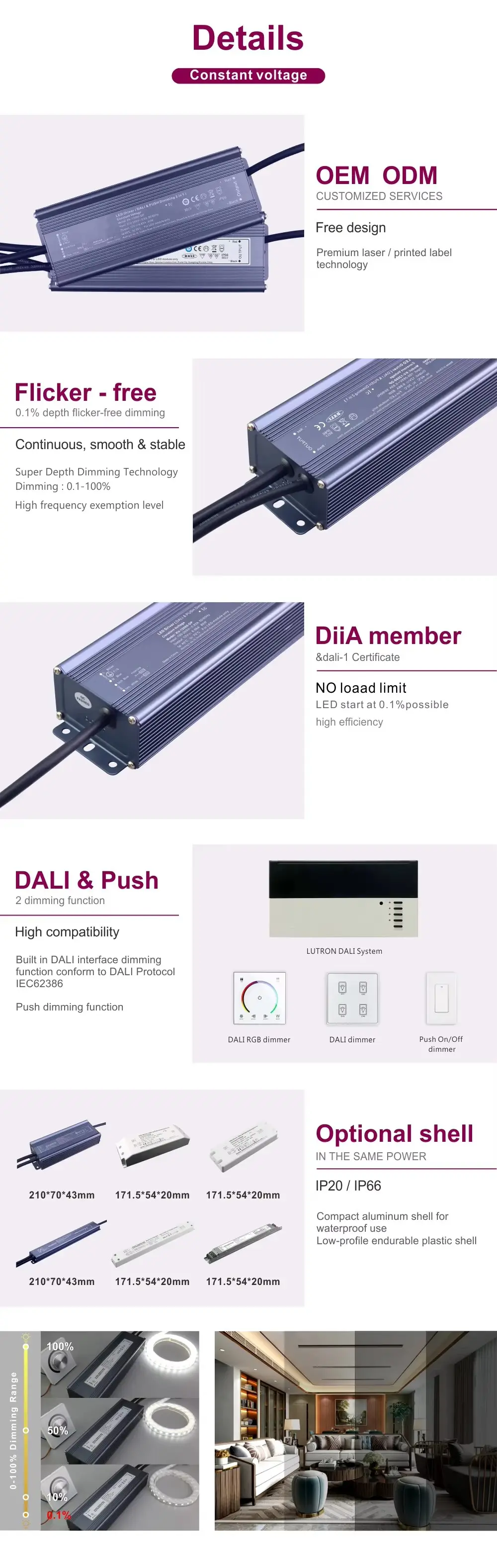 Konstruert for feilfri ytelse, har den ekte flimmerfri drift og et ultra-jevnt dimmeområde på 0,1 % til 100 %, noe som muliggjør perfekt lyskvalitet og stemning. Tilgjengelig i et bredt effektområde fra 10W til 360W, med 12V eller 24VDC-utgang, er det den ideelle, fremtidssikre strømløsningen for et stort utvalg av LED-strips og moduler med konstant spenning.