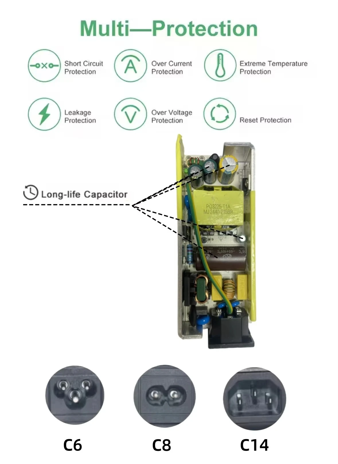 Omfattende sikkerhetsbeskyttelse: Integrerte sikkerhetstiltak, inkludert Over-Current Protection (OCP), Over-Voltage Protection (OVP) og Short-Circuit Protection (SCP) forhindrer skade på både adapteren og ditt verdifulle utstyr.