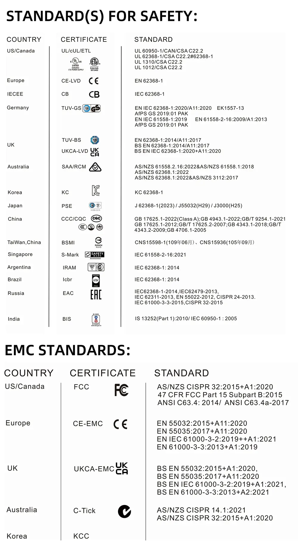 Din sikkerhet er viktigst. Denne adapteren er designet og produsert for å møte strenge internasjonale standarder, og sikrer ikke bare pålitelig ytelse, men også trygghet. Den er i samsvar med ETL CE FCC TUV GS CB PSE KC KCC BIS SAA RCM c-Tick CCC UKCA UL cUL RoHS , som regulerer sikkerhet, helse og miljøvern.
