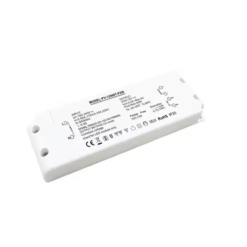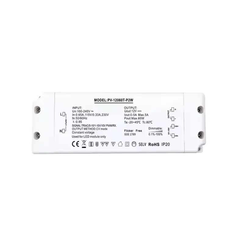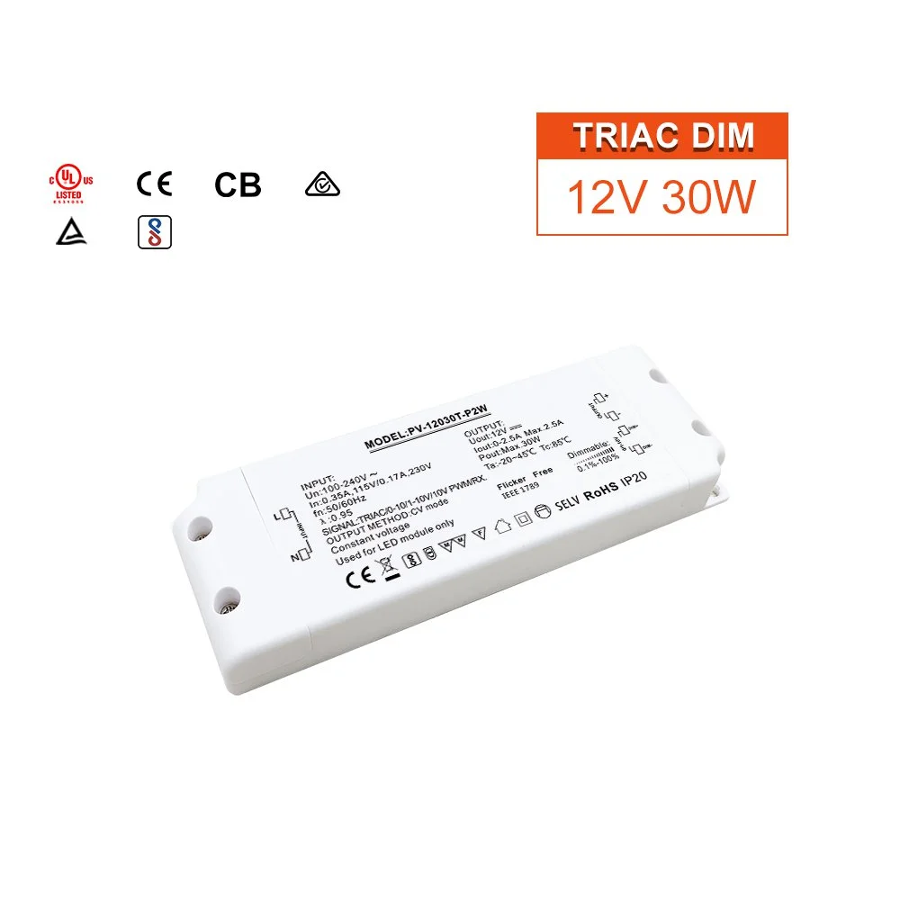 Som en stabil konstant spenning strømforsyning Triac dimming led driver, gir den en konstant 12V DC spenningsutgang. Denne 12V 30W triac dimbare strømforsyningen tar i bruk høykvalitetskomponenter og avansert kretsdesign, som sikrer stabil utgangsspenning gjennom hele dimmeområdet og eliminerer fundamentalt flimring av lys. Det er en virkelig flimmerfri triac dimming LED driver for innendørs bruk. Dens ikke-flimrende funksjon skaper ikke bare et behagelig og sunt visuelt miljø, men beskytter også effektivt sensitive LED-lyskilder og -moduler, og forlenger den totale levetiden til lysarmaturene.