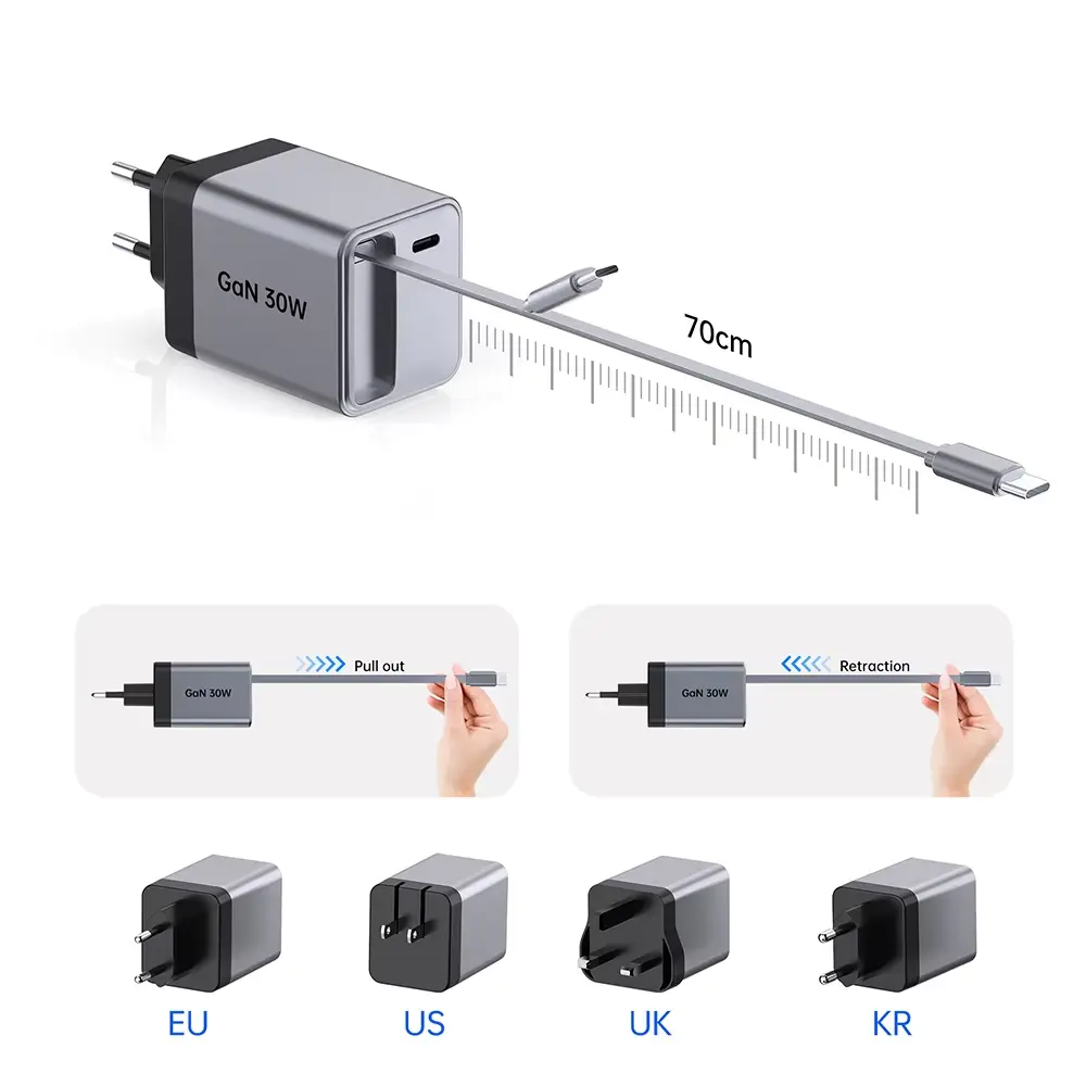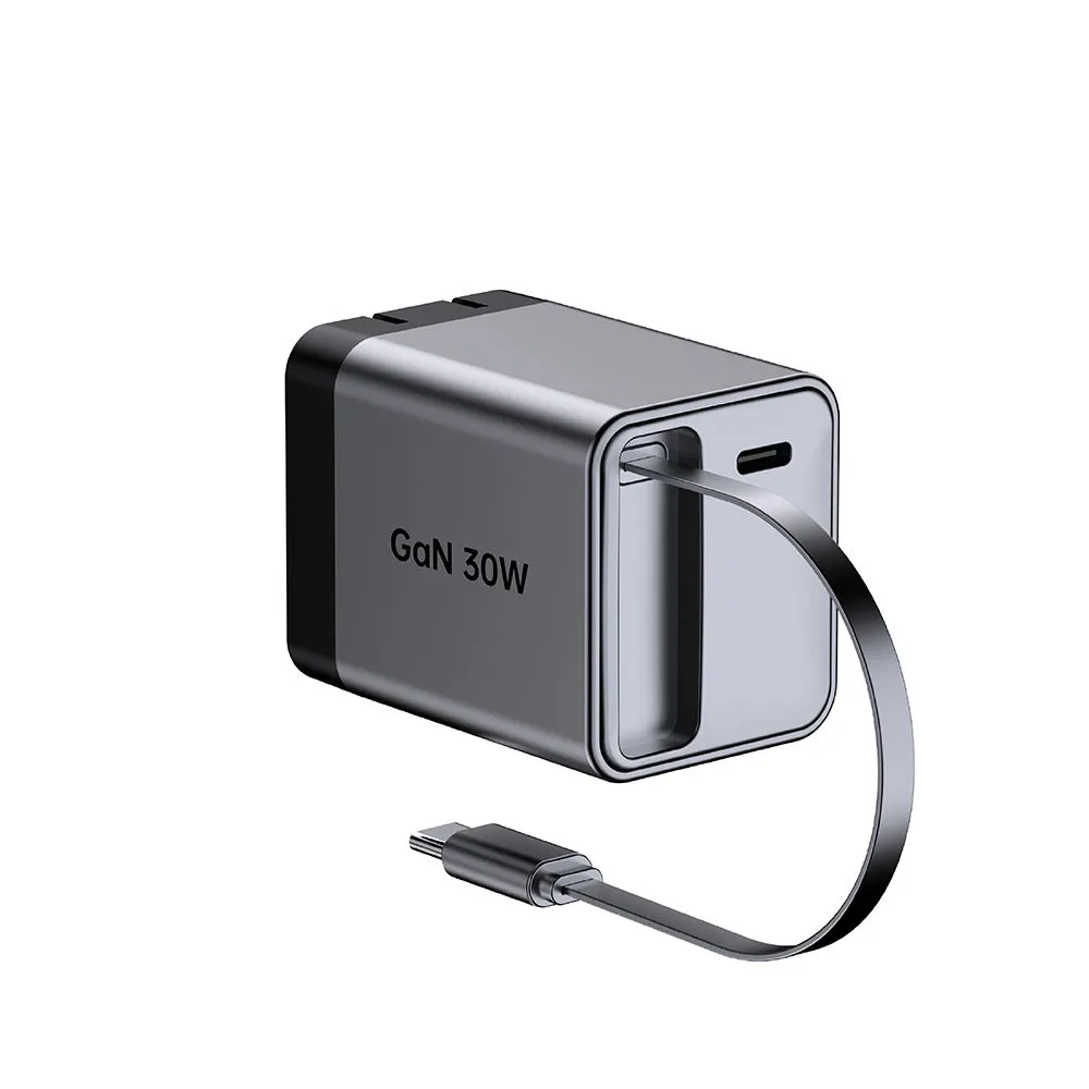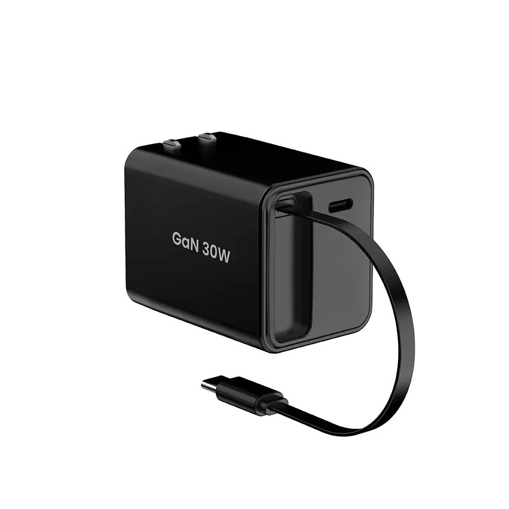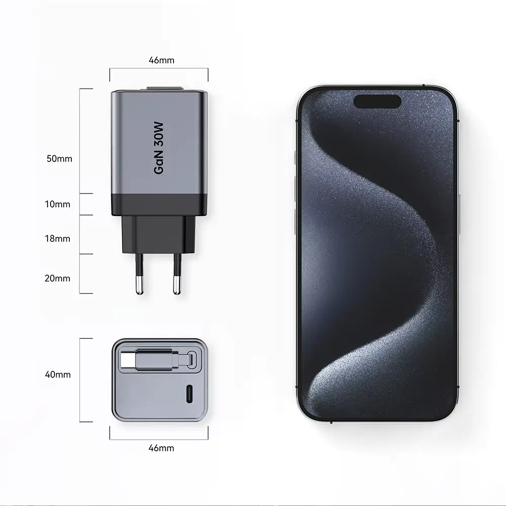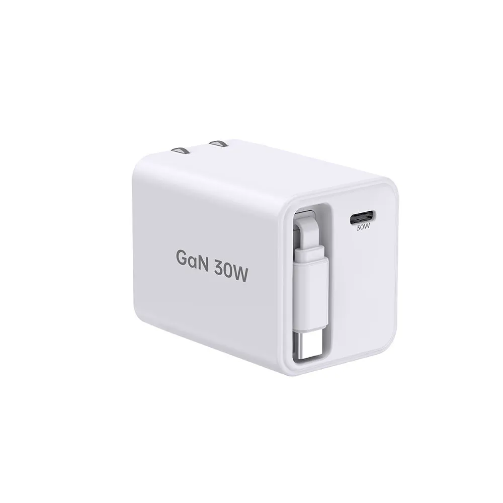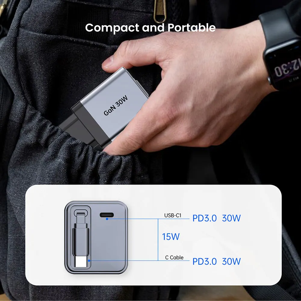 30 W hurtiglader med uttrekkbar Type C-kabels ultralette design i lommestørrelse gjør den lett å bære rundt. Det er det perfekte valget for hjem, kontor eller reise.