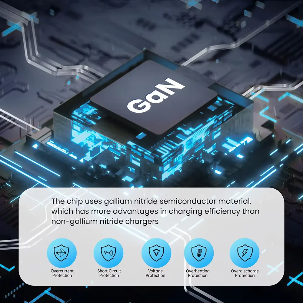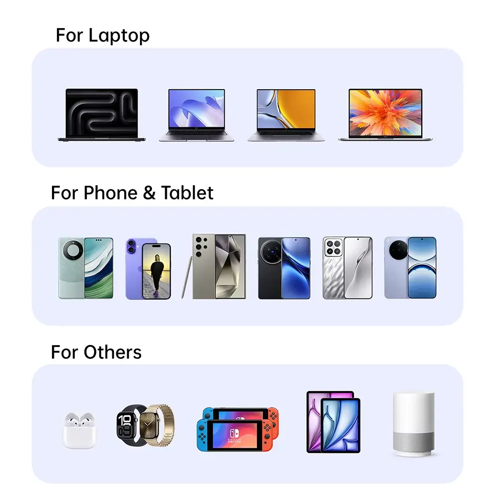Kompatibel med USB-C-enheter, inkludert mobiltelefoner, hodetelefoner og spilltilbehør. Oppdager automatisk enhetens behov for sikker og effektiv lading. 4. Reiseklar bærbarhet