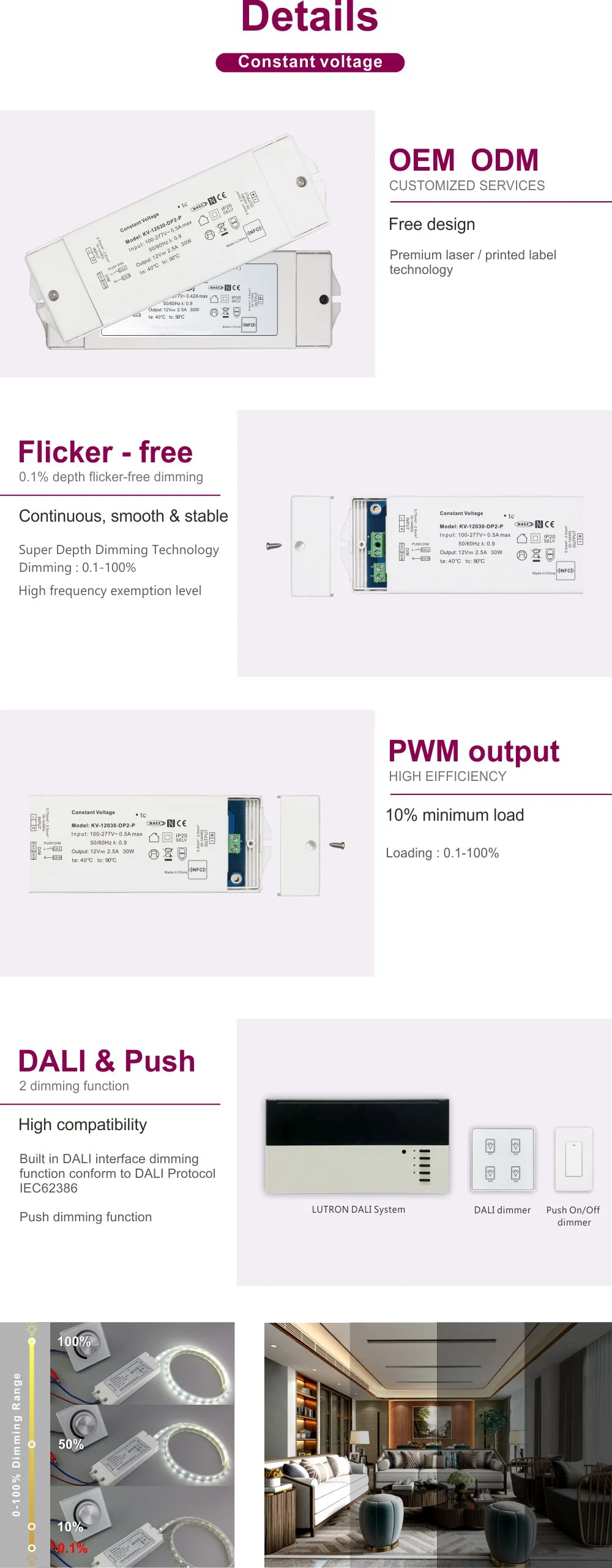 36V konstantspenning 30W DALI dimbar LED-driver, med sin stabile konstante spenningsutgang, kraftige kontrollevne til DALI-protokollen, høykvalitets flimmerfri lyseffekt, bred spenningstilpasning og pålitelig sikkerhetssertifisering, gir et kraftig og intelligent "hjerte" for ulike LED-belysningsapplikasjoner.