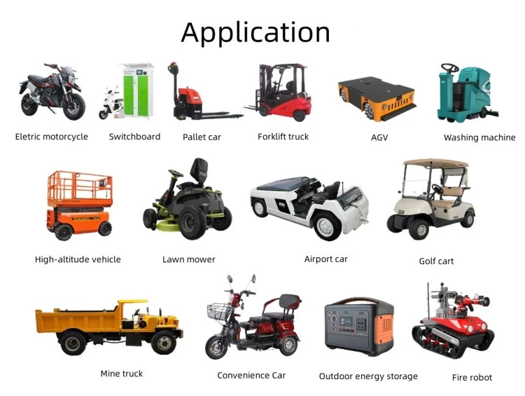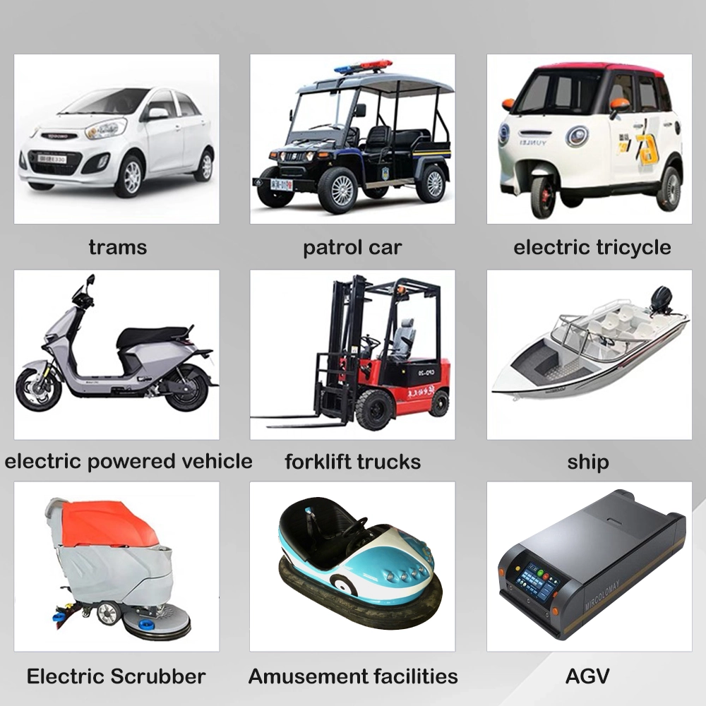 Produktapplikasjoner Elektriske støtfangerbiler og fornøyelsesturer Sightseeingbiler og golfbiler Patruljebiler og sikkerhetsvogner Gaffeltrucker og materialhåndteringsutstyr Gulvskrubber og rengjøringsmaskiner Automatiserte guidede kjøretøy (AGV) for lager Elektriske skip, båter og marine nyttefartøyer