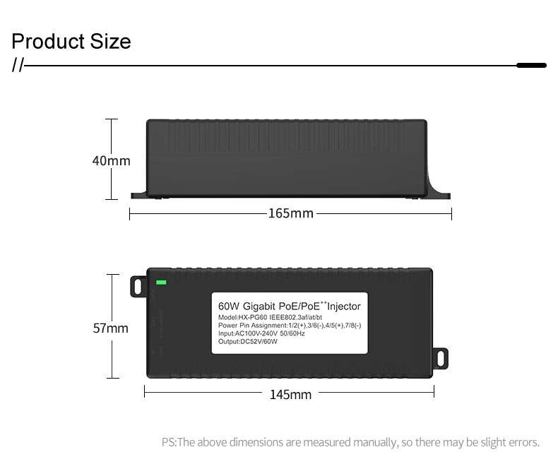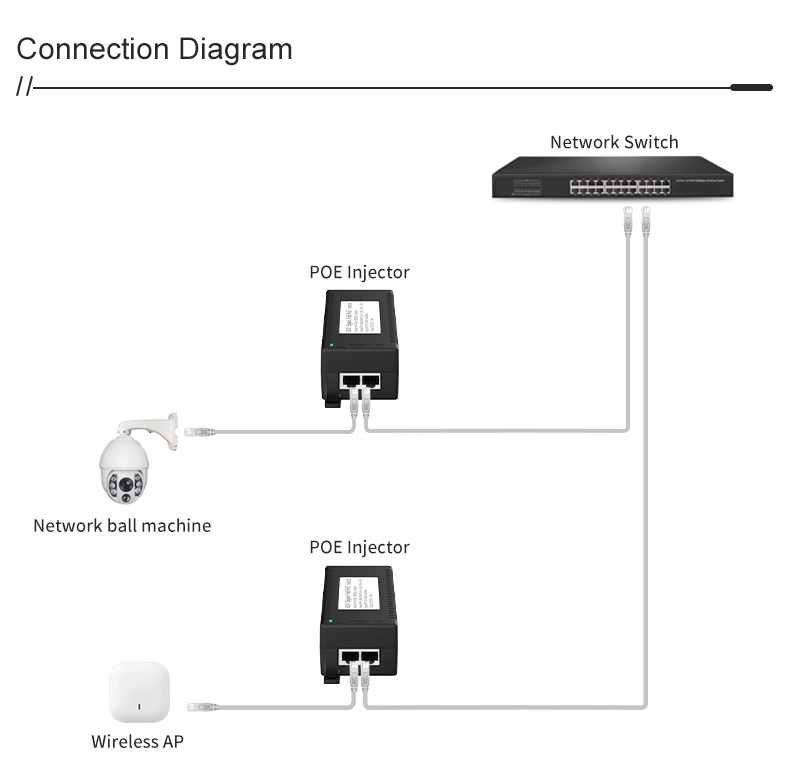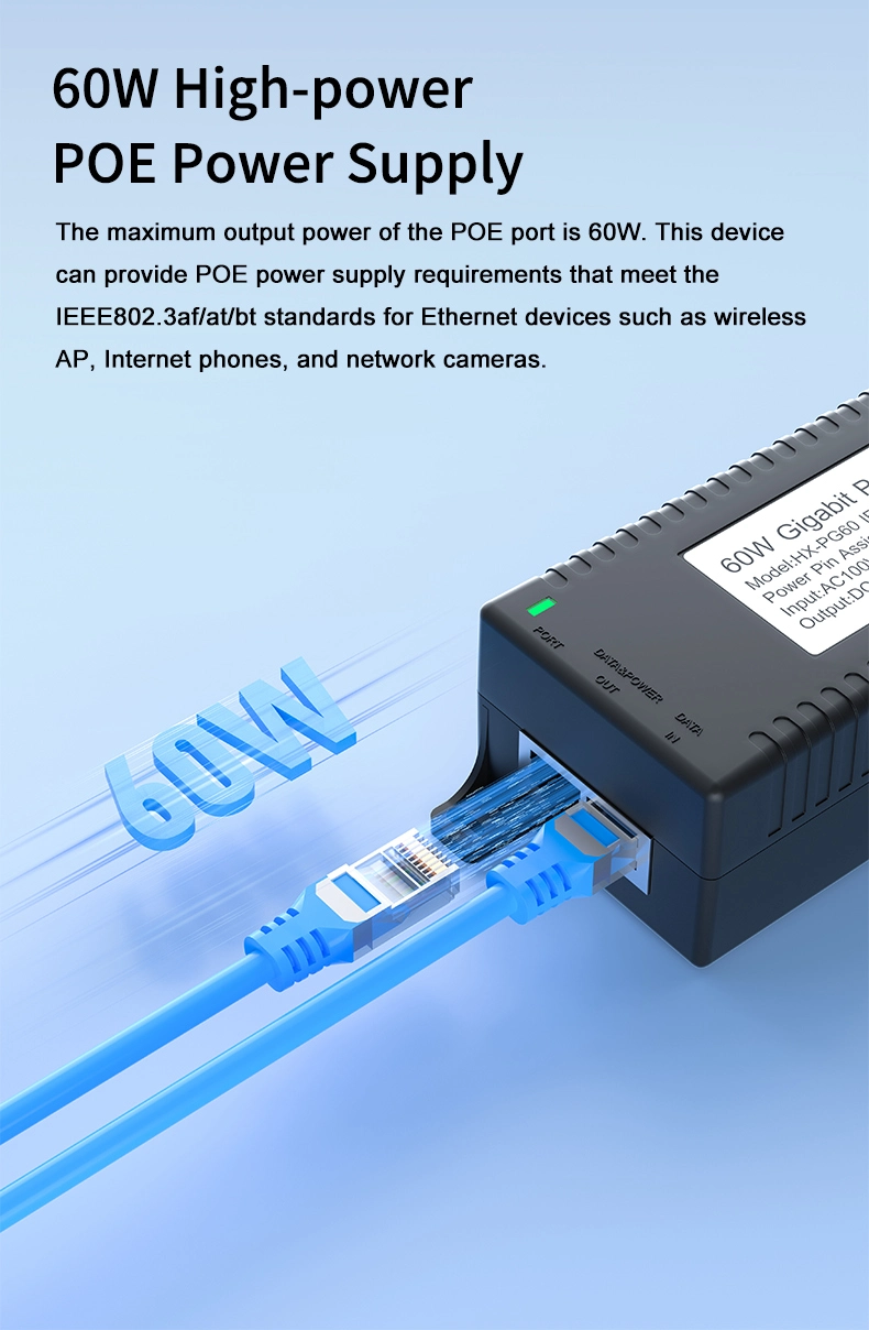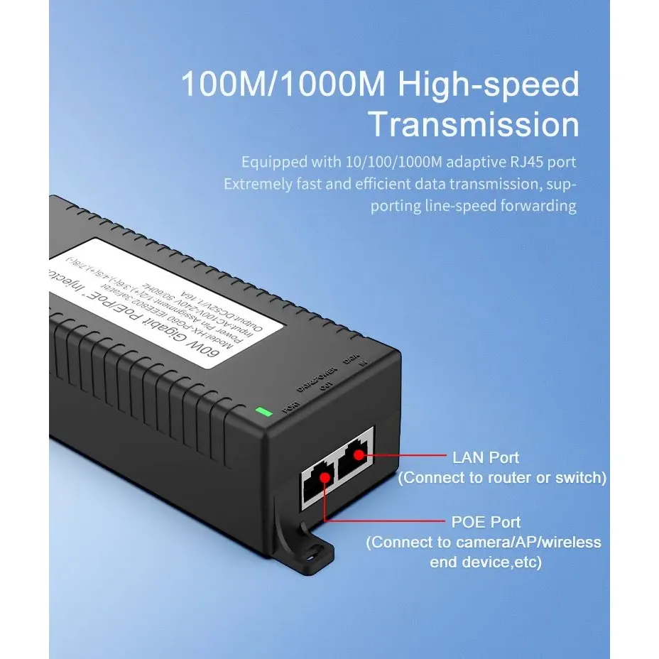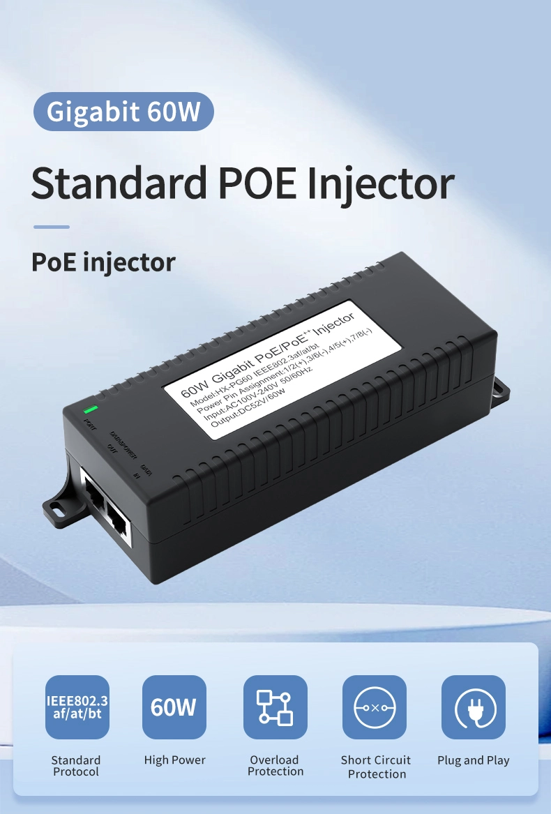 Sikkerhetsovervåking: Gigabit 60 W desktop POE-injektor for IP-kamerasikkerhet og nettverksenhet gir stabil strøm til IP-kameraer og PTZ-kameraer.
