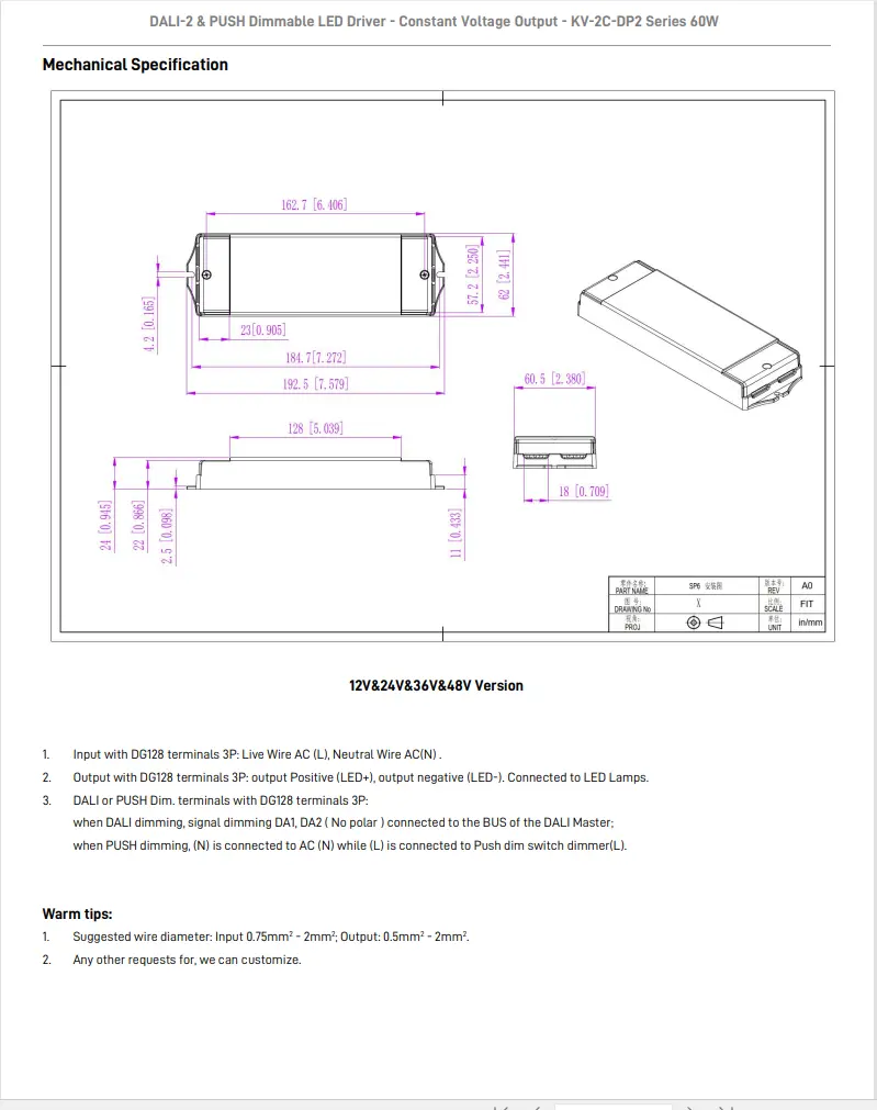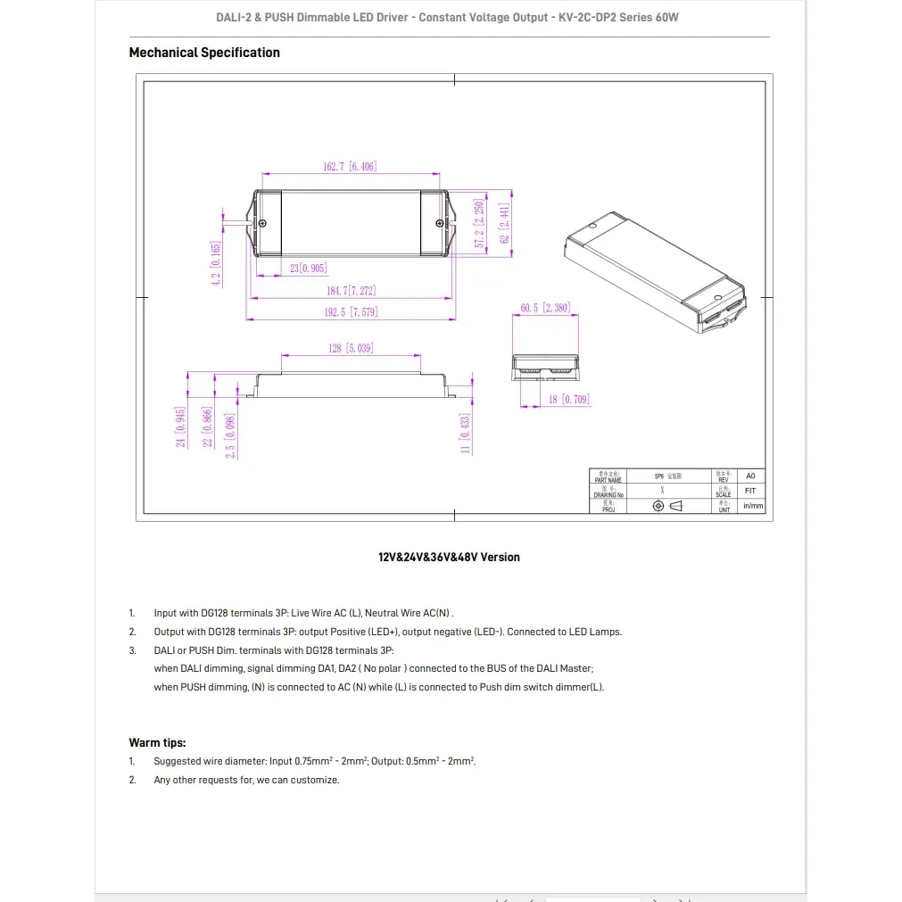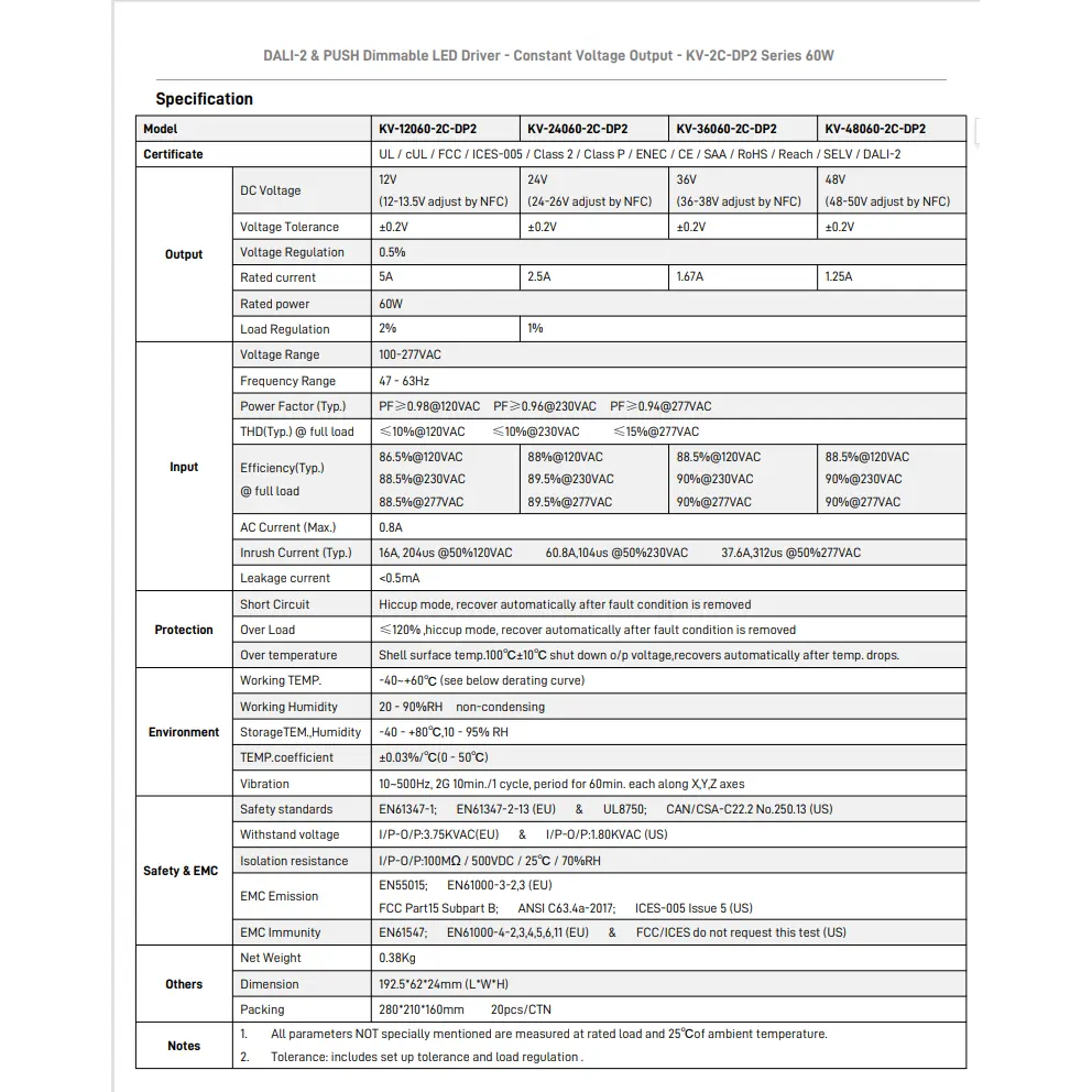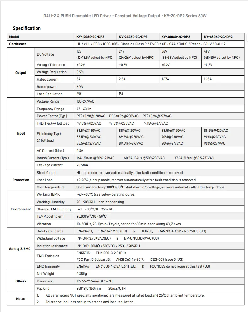 Dimmefunksjon: DALI-2 & PUSH 2 i 1 dimming (CCT). PWM utgangsfrekvens 4KHz.