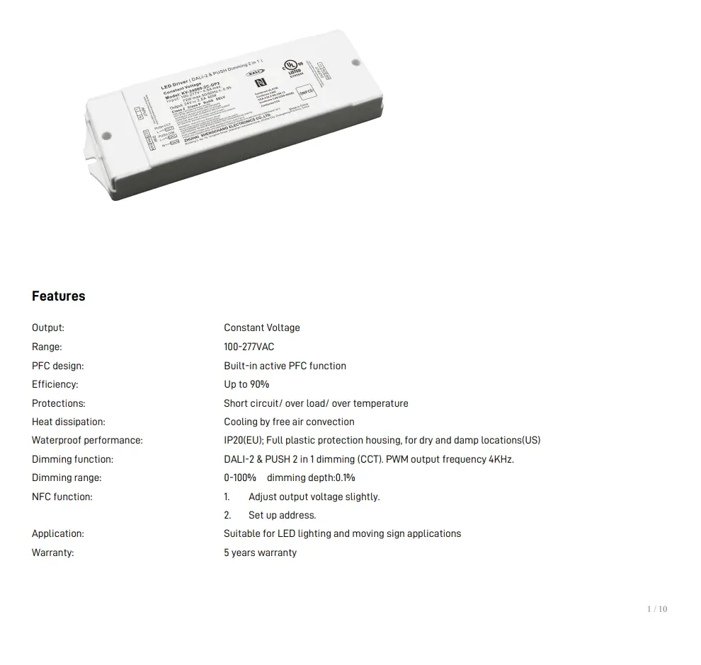 Denne typen drivere lar brukere justere lysstyrke og fargetemperatur (CCT) jevnt fra varmhvitt til kjølighvitt, samtidig som den opprettholder stabil effekt for LED-armaturer som paneler, stripelys og downlights.