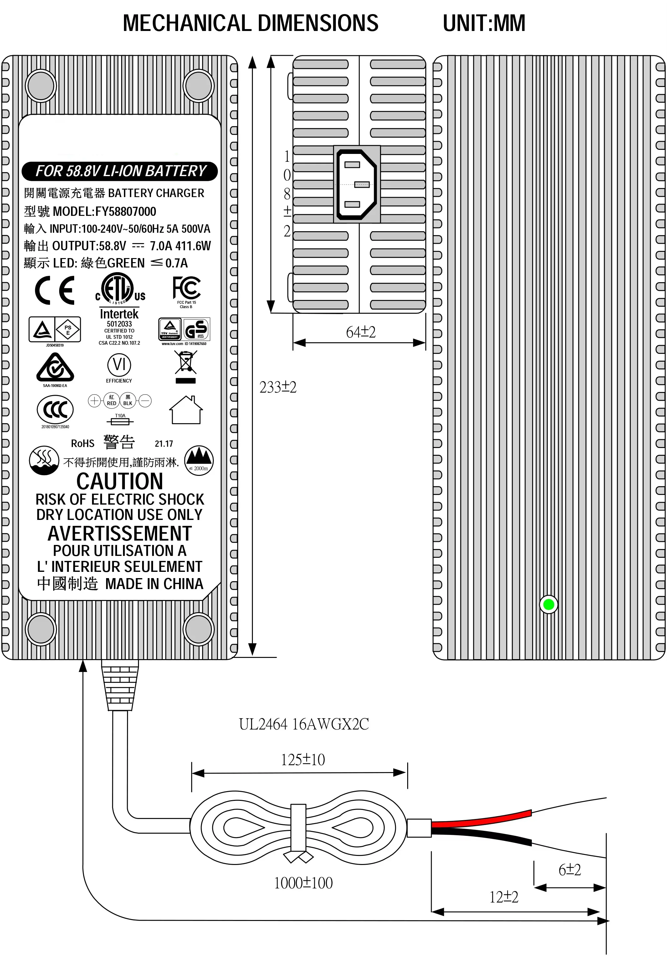 Sertifisert i henhold til UL, ETL, CUL, GS, CE, BS, SAA, KC, PSE, CB, FCC, EMC, RoHS, REACH-standarder, leverer denne laderen effektiv, rask og sikker kraft for krevende elektriske mobilitetsapplikasjoner.