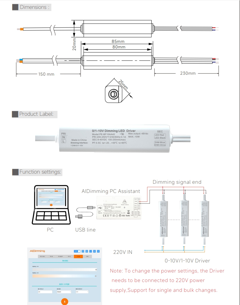 1. Før du får tilgang til dimmesignalet, må du bekrefte om kontrollsignalet er 0-10V eller 1-10V, og signal- og strøminnstillingene kan endres via AIdimming PC og programvare. Strømforsyningen for å endre parameterne må kobles til 220V strømforsyningen, som kan endres i batcher.