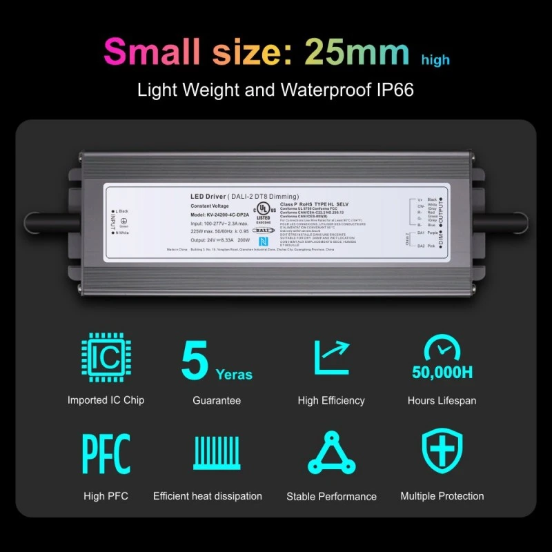 Kvaliteten og tryggheten vi lover gjenspeiles i hver detalj. Produktet har oppnådd UL-sertifisering, oppfyller strenge internasjonale sikkerhetsstandarder, og leveres med 5 års garanti for kvalitetssikring. I et nøtteskall er dette ikke bare en strømforsyning; det er et kraftig, pålitelig og fleksibelt hjerte for lysstyring. Ved å velge denne ekte DALI 2 DT8 dimbare 200W LED-driveren, velger du en smart belysningsløsning av profesjonell kvalitet som er fremtidsrettet.