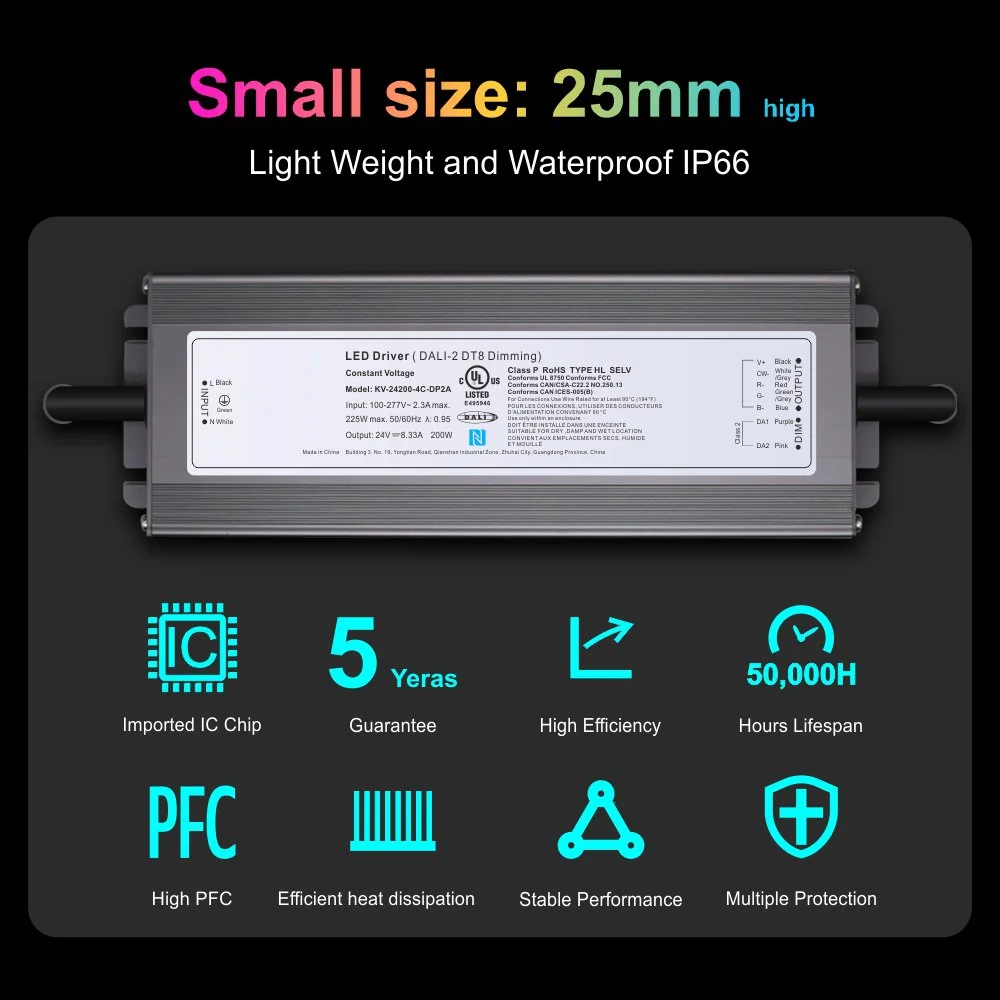 Dette produktet er en DALI Constant Voltage 200W CCT dimbar LED-driver, som representerer en avansert løsning for avansert kommersiell og smart hjemmelyskontroll. Som en kjernekomponent som er fullt kompatibel med DALI 2 DT8 dimbar 200W LED Driver-standard, muliggjør den ikke bare jevn og trinnløs lysstyrkejustering, men tilbyr også, gjennom den utvidede DT8-protokollen, presis og digital styring av fargetemperatur (CCT) og jevn farge (RGB) lys, og gir designere enestående dynamisk lys og skyggemuligheter.