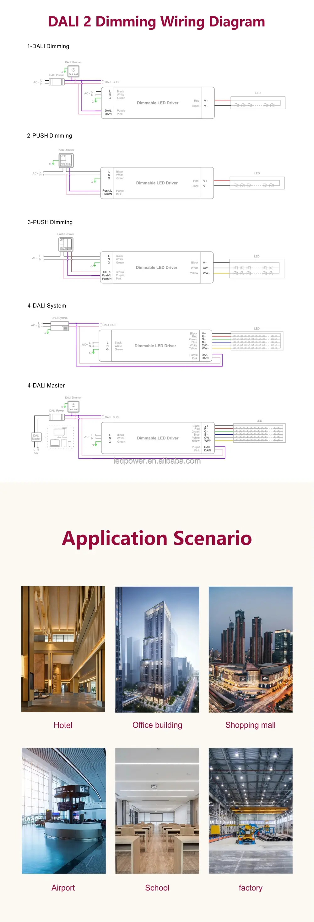 Enten det er enkel enfarget temperaturdimming eller kompleks 5-kanals Rgb Cct-sceneprogrammering, kan denne driverens strømforsyning svare stabilt på standard DALI-instruksjoner. Dette betyr at du enkelt kan integrere den i ethvert DALI smart belysningssystem for å oppnå gruppekontroll, tidsstyrt programmering og sensorkobling. Som en pålitelig 12-24 Volt konstant spenning DALI dimbar LED-driver, sikrer dens enestående elektriske ytelse at LED-lysstrimler fungerer stabilt og effektivt i lang tid.