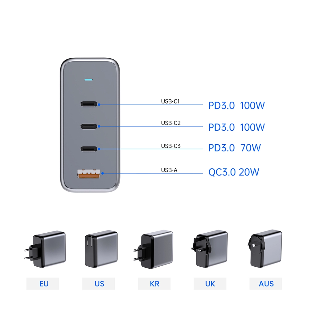C1/C2-utgang: 5V3A, 9V3A, 12V3A, 15V3A, 20V5A, PPS: 3,3-20V5A (maks. 100 W) C3-utgang: 5V3A,9V3A,12V3A,15V3A,20V3.5A, (70W Maks) PPS:3.3-11V5A USB-A-utgang: 5V3A,9V2A,12V1.67A,SCP:3.3-11V2A (22W Maks) C1+C2/C1+C3 Effekt:70W+30W C1+C2+(C3+USB-A) Utgang: 40W+40W+15W Totalt: 100W |