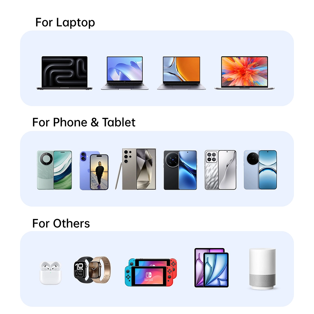 100W kraftig effekt: Energistasjonen til den bærbare datamaskinen I kjernen støtter USB-C1- og C2-portene hver topputgang på opptil 100W. Denne kraftige overføringskapasiteten er tilstrekkelig til å møte hurtigladingskravene til de fleste bærbare datamaskiner. Enten du bruker en MacBook Pro eller andre høyytelses ultrabooks, kan ladeytelsen deres være sammenlignbar med de originale laderne, eller enda raskere. Hold deg energisk, fokuser på skapelse og produktivitet, og ikke bekymre deg for batterilevetiden når du bruker enheten.