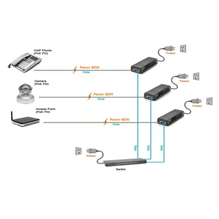 Leverer opptil 60W utgang og støtter fullt ut IEEE 802.3bt/at/af-standarder. Den driver både enheter med lav effekt (15,4 W) og utstyr med høy effekt (30 W/60 W), og dekker nesten alle Ethernet-drevne enheter og sikrer sterk PoE-kompatibilitet.