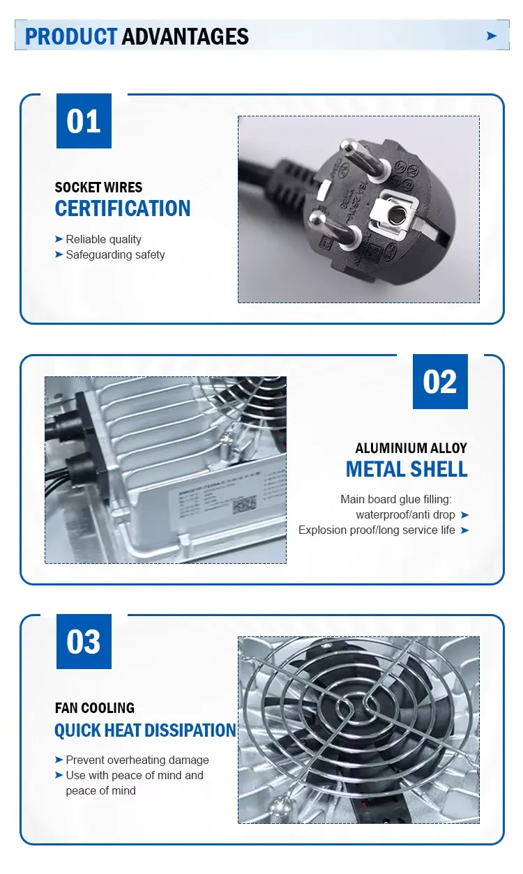 Høy effektivitet og smart beskyttelse: Denne laderen oppnår opptil 93 % effektivitet og en effektfaktor på ≥0,98, og minimerer energitapet og reduserer driftskostnadene. Innebygde beskyttelser inkluderer overspenning, kortslutning, omvendt polaritet og overtemperatursikring. En LED-indikator gir klar ladestatus med et øyeblikk.