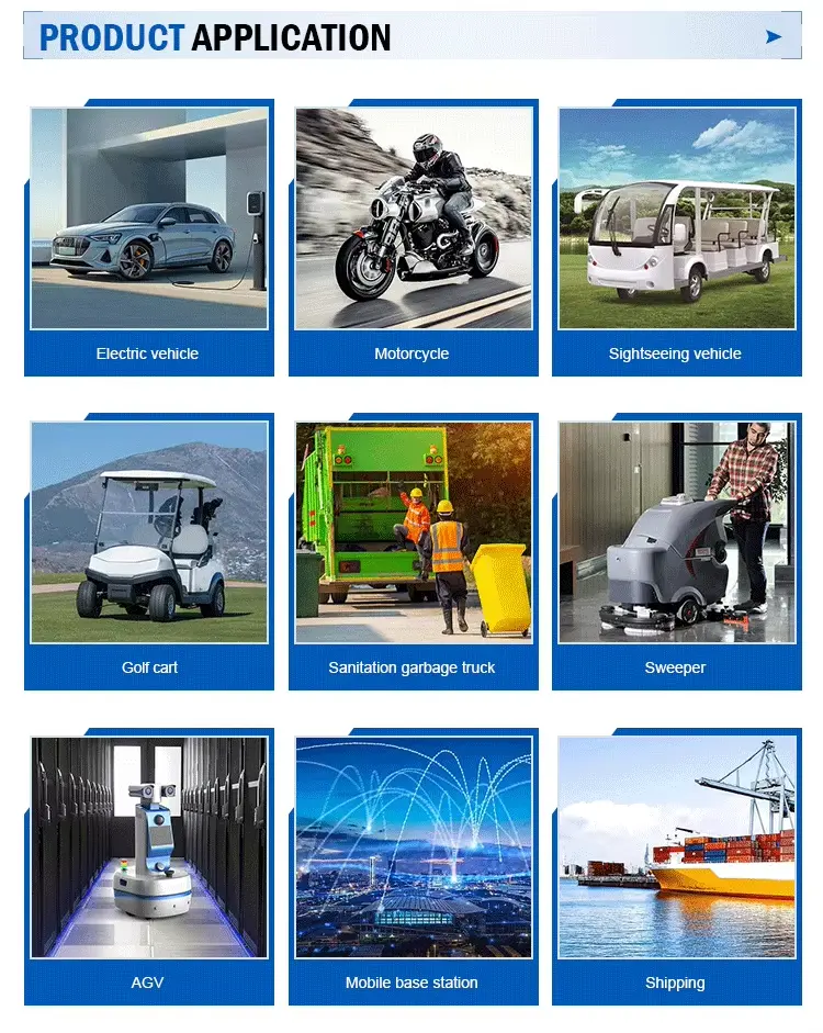 Bruk: Motorsykkel/scooter, trehjulssykkel, Cropper, Sweeper, Gaffeltruck, Lastebil, Elbuss, Blybatteri, Elbil, Sightseeingkjøretøy, Logistikkkjøretøy, Rengjøringskjøretøy, Patruljebil, Dune buggies, Skip, Kommunikasjonsutstyr