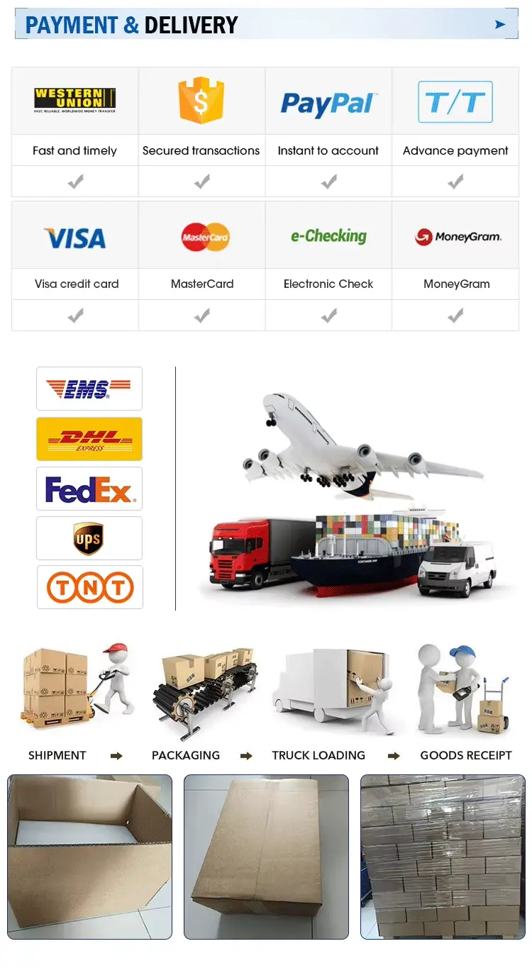 A4: Små bestillinger sendes med ekspress (FEDEX, DHL, EMS, TNT). Store bestillinger sendes til sjøs eller med fly. FOB-pris tilgjengelig. Du kan bruke din speditør eller vår.