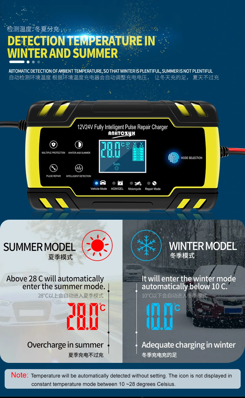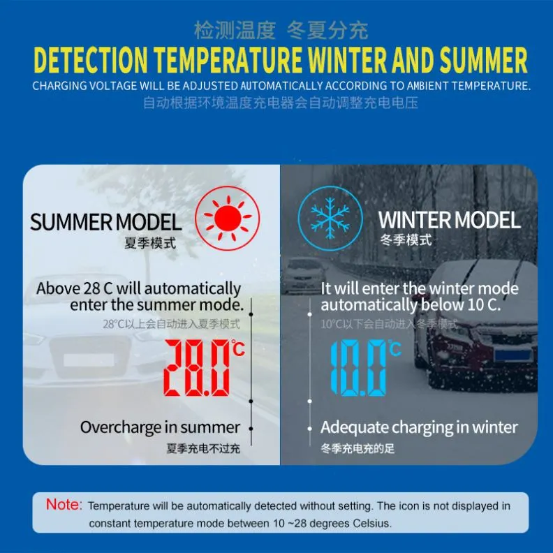 · Autovedlikeholdsmodus: Fungerer som vedlikeholdslader og langsiktig batterivedlikehold, ideell for sesongmessige eller sjelden brukte kjøretøy.
