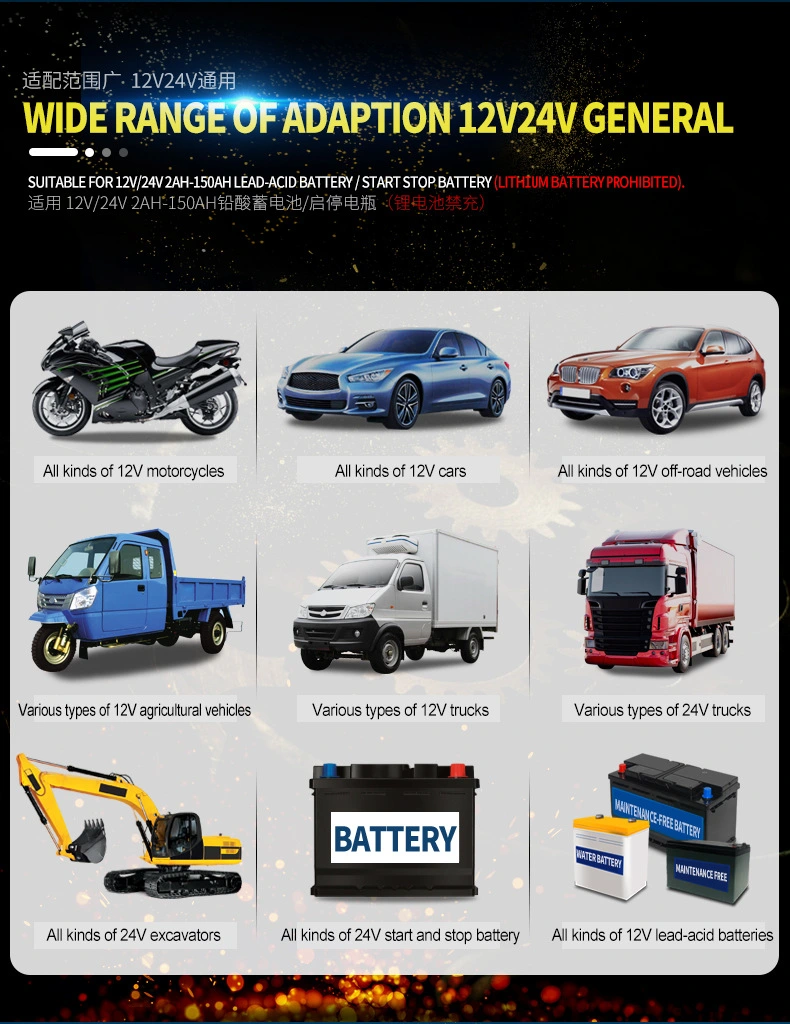 · Dobbel spenningsutgang: Støtter 12V 8A og 24V 4A, noe som gjør den kompatibel med et bredt spekter av kjøretøy, inkludert biler, SUV-er, motorsykler, lastebiler og yachter.