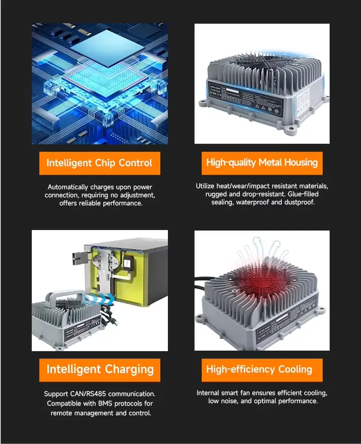 · Integrert OBC-kommunikasjonsprotokoll tillater intelligent ladestyring, og beskytter batterier mot overlading, overoppheting og kortslutninger.