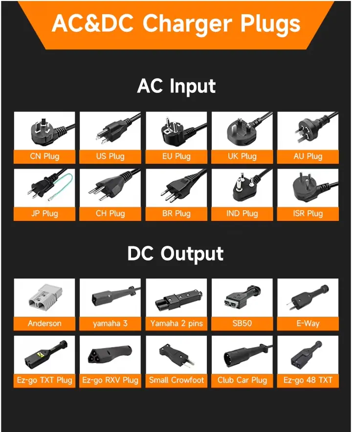 EU-pluggen, vanligvis for EU-land som Tyskland, Frankrike, Nederland, Danmark, Østerrike, Sverige, etc. UK-pluggen, vanligvis for Storbritannia, India, Pakistan, Singapore og etc. AU-pluggen, vanligvis for Australia, New Zealand, Argentina og etc. De vanlige DC-kontaktene på markedet inkluderer Anderson, EZ-go, DS Club Car og Yamaha Connector, etc.