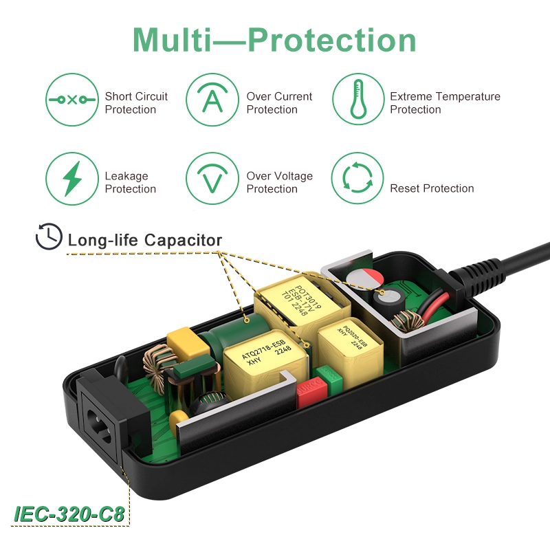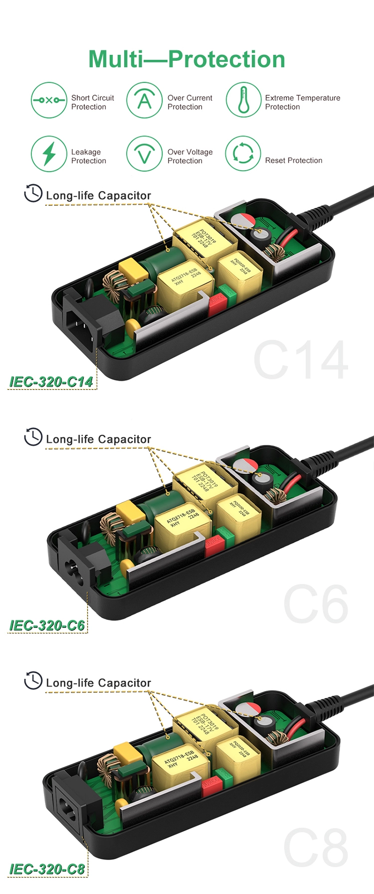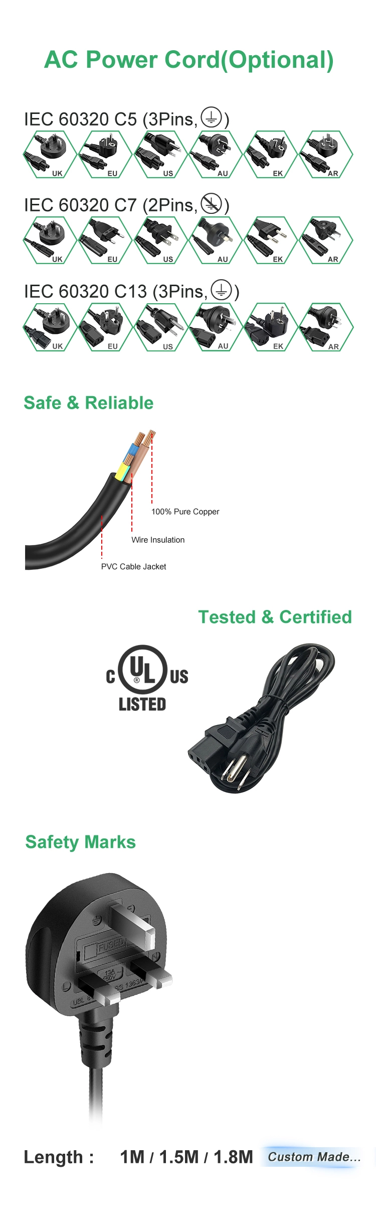 * Flere enheter for 200W-serien: 5V/8V/9V/12V/13,5V/15V/18V/19V/24V/25V/30V/36V/29V/30V/42V/48V tilgjengelig * Sikkerhet: OCP/OVP/OTP, SCP, automatisk overbelastningsavskjæring, overspenningsbryting, automatisk termisk stans. * Bred kompatibilitet: LED Strip-lys, 3D-skriver, radiosender/mottaker, CCTV-kameraer, subwoofer-forsterker for bil, lydforsterker, trådløs ruter, ADSL Cats, luftfukter, HUB, tastatur, BT-høyttaler, skjerm, webkamera, DVR, NVR, lyd-/videostrømforsyning