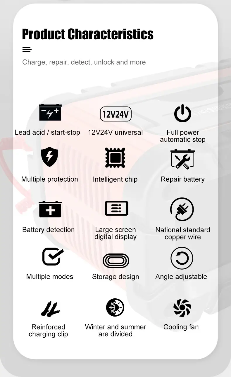TK700 Universal 12V 24V blysyrebatterilader fra Starwell, en profesjonell produsent og leverandør i Kina, er et høyytelses intelligent ladesystem designet for et bredt spekter av blysyrebatterier. Den er bygget for bil-, marine-, industri- og nødstrømapplikasjoner, og kombinerer automatisk spenningsdeteksjon, avansert reparasjonsteknologi og stabil utgangskontroll for å sikre pålitelig energigjenoppretting og langsiktig batterivedlikehold. TK700 Universal 12V 24V blybatterilader er konstruert for å levere både hurtiglading og dypt vedlikehold i én kompakt enhet.
