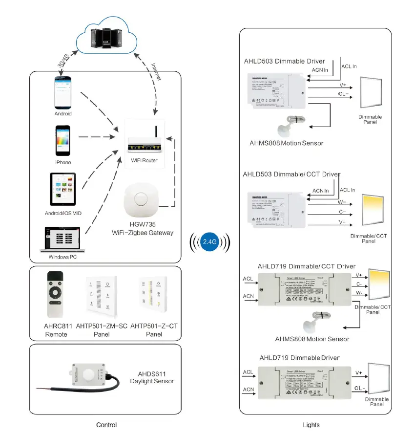 * Zigbee trådløs kontroll: smarttelefon, nettbrett, PC, veggbryter, fjernkontroll