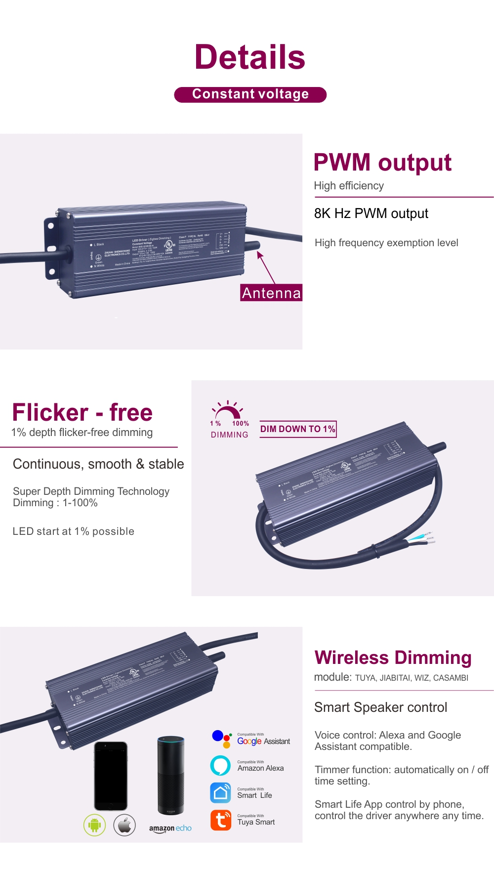 Denne Tuya Zigbee Wireless Dimming Constant Voltage 120W LED-driveren er dypt integrert med Tuya Smart-økosystemet og bruker den nyeste Zigbee 3.0-kommunikasjonsprotokollen for sømløs toveiskommunikasjon.