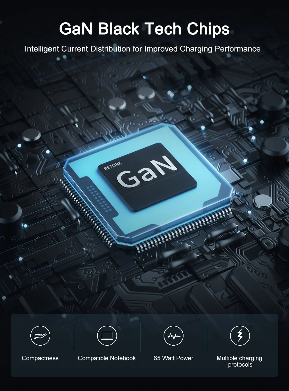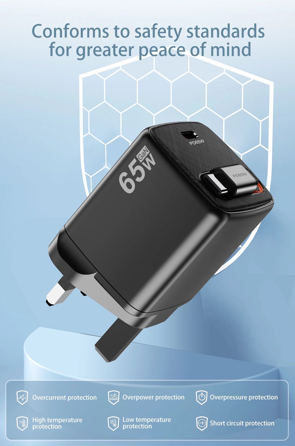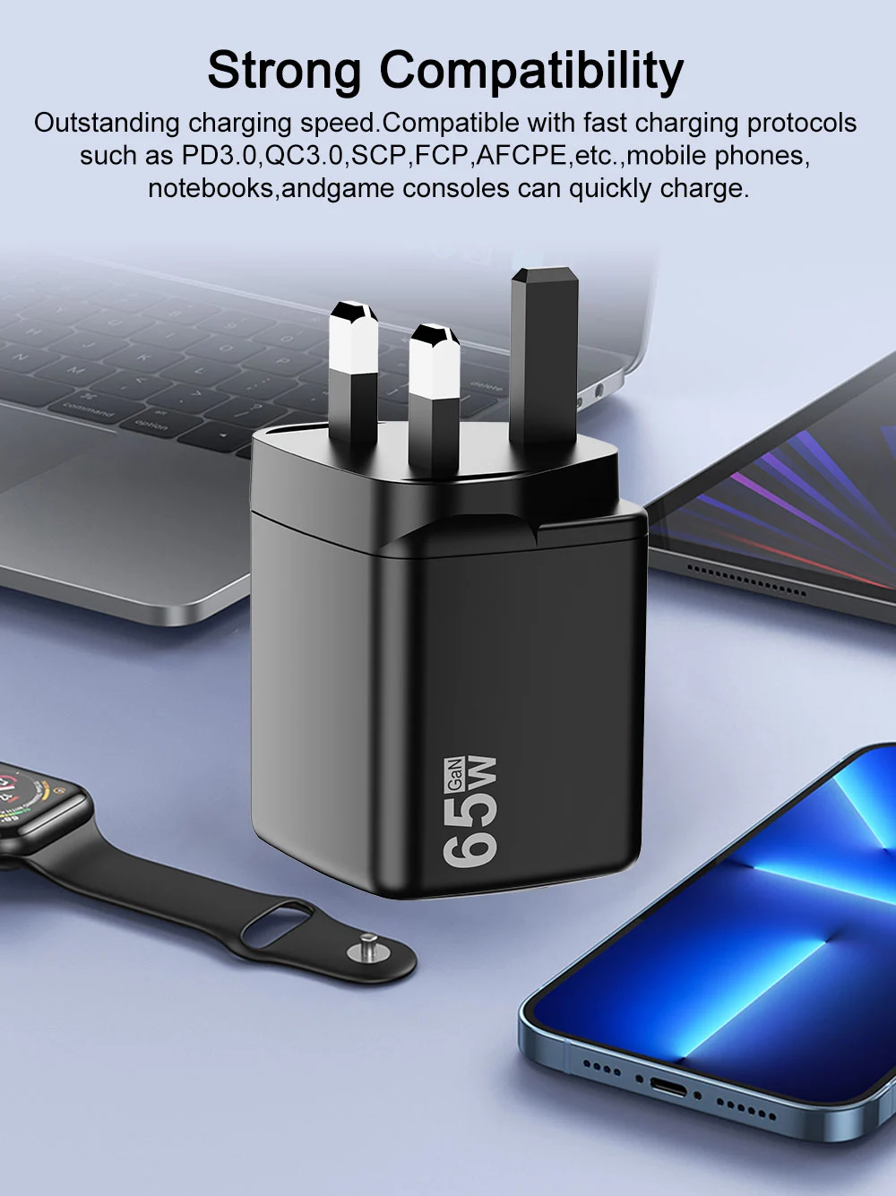 - Rask lading: 65W utgang reduserer ladetiden, og får enhetene dine raskt oppstartet.